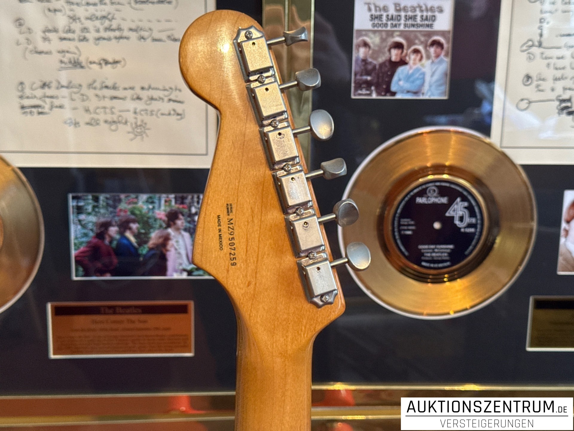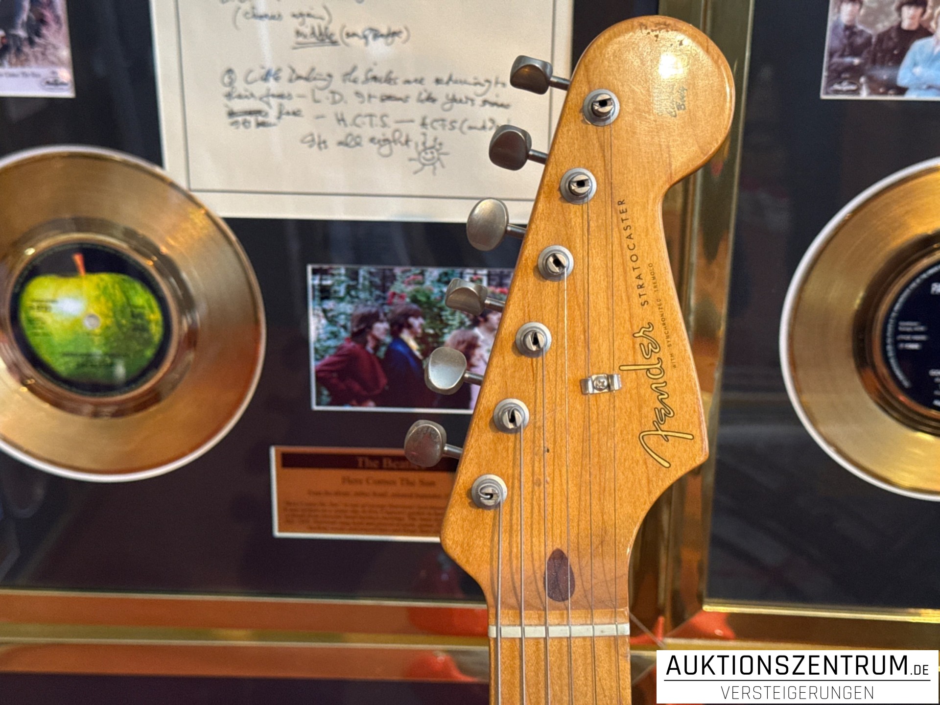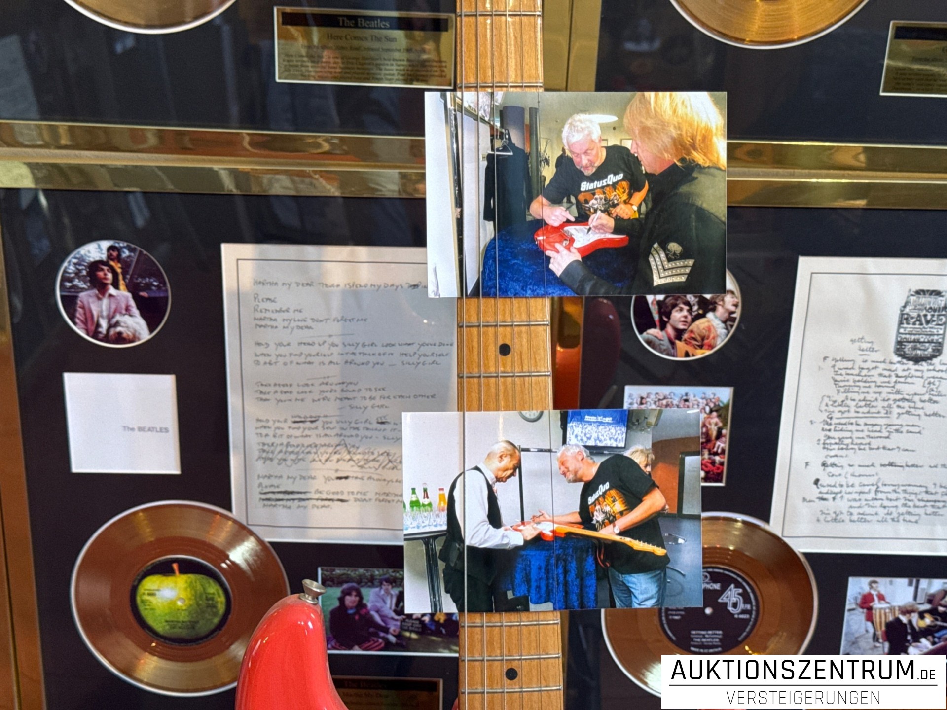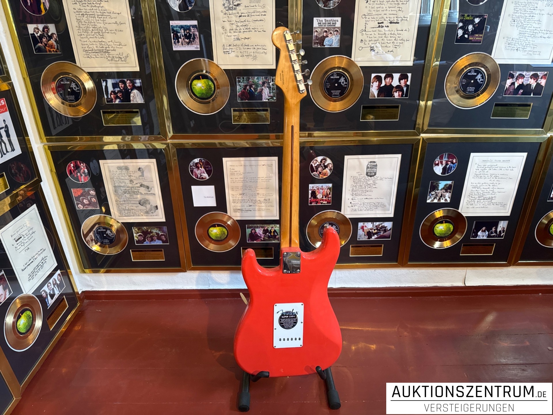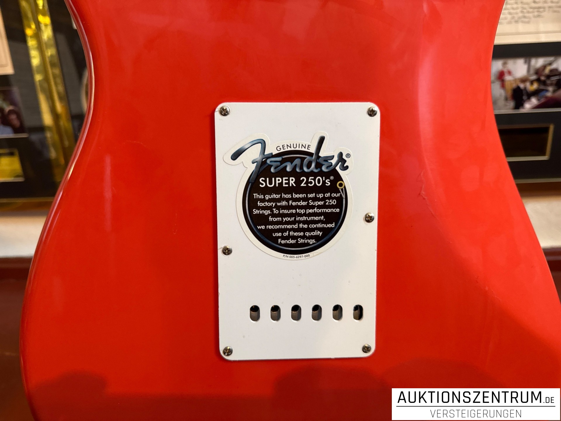 Die Fender E-Gitarre Modell Stratocaster trägt die Signaturen von Francis Rossi und Rick Parfitt und wurde von den Künstlern persönlich übergeben. Die Signatur ist durch Fotos belegt, welche dem Artikel beigelegt sind.