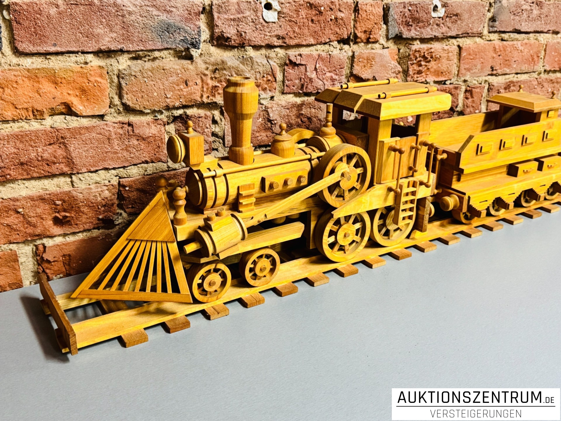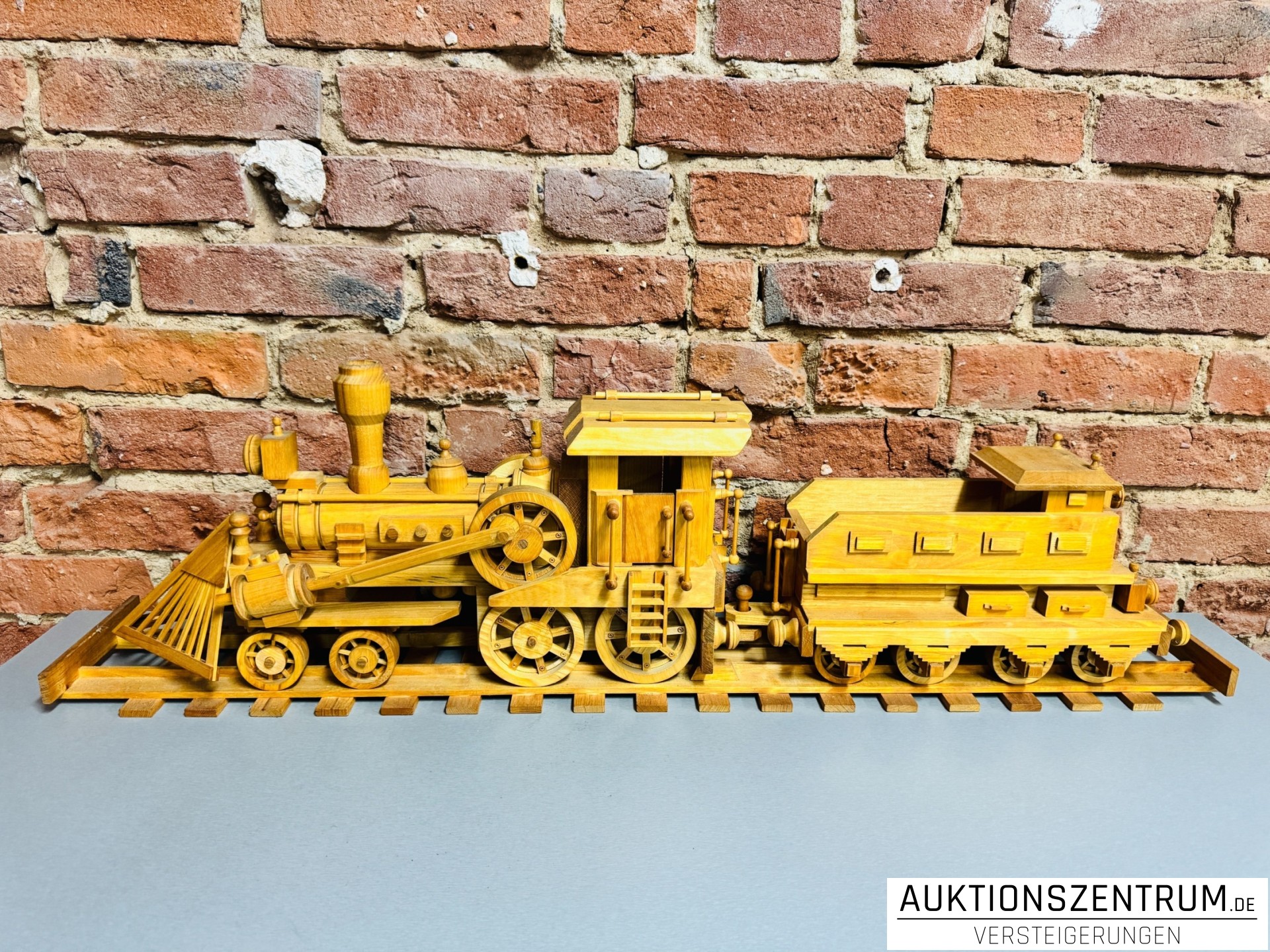 Aufwendig gearbeitete, große Dampf-Lokomotive mit angehängtem Tender als dekoratives Holzmodell.