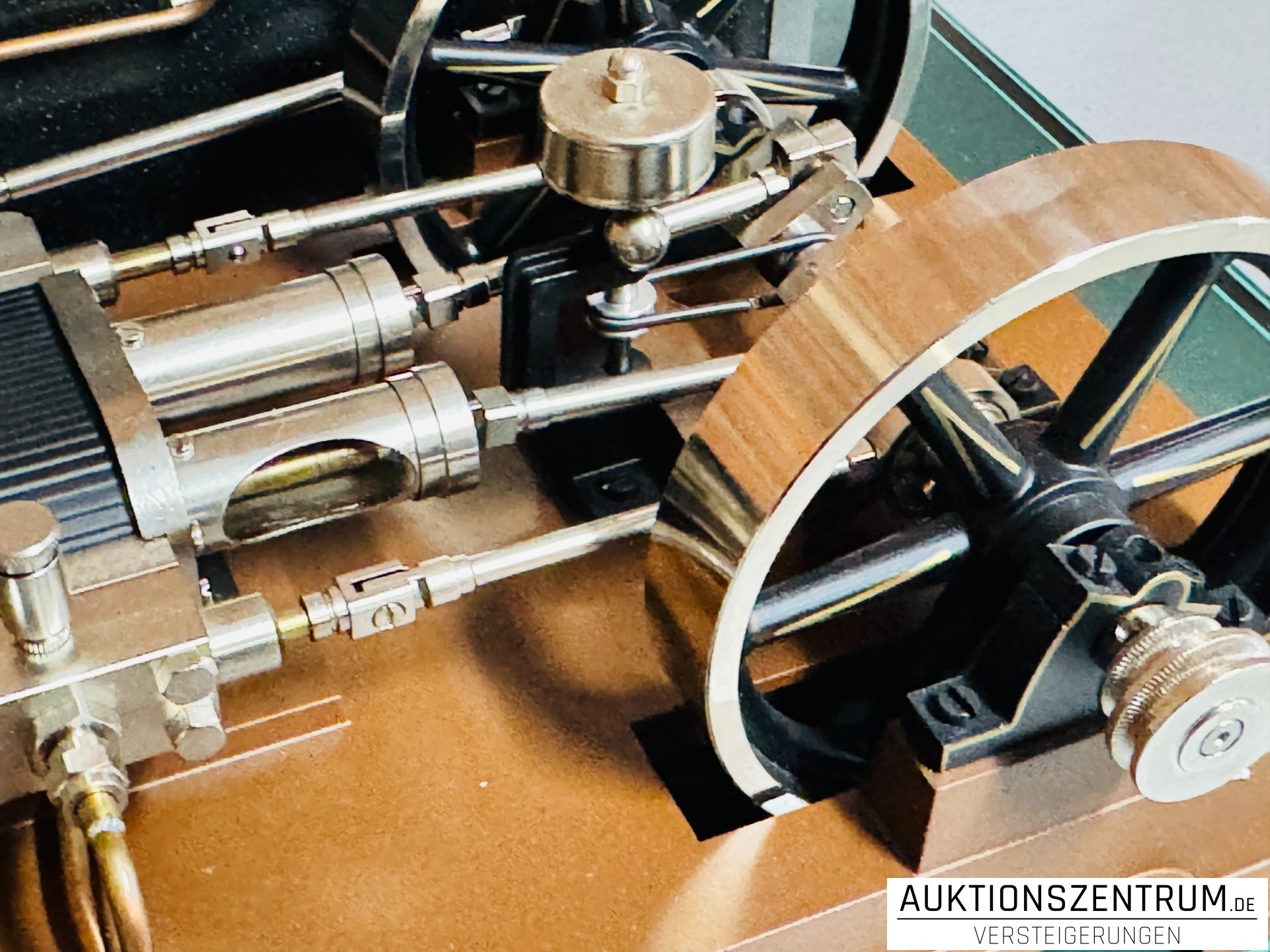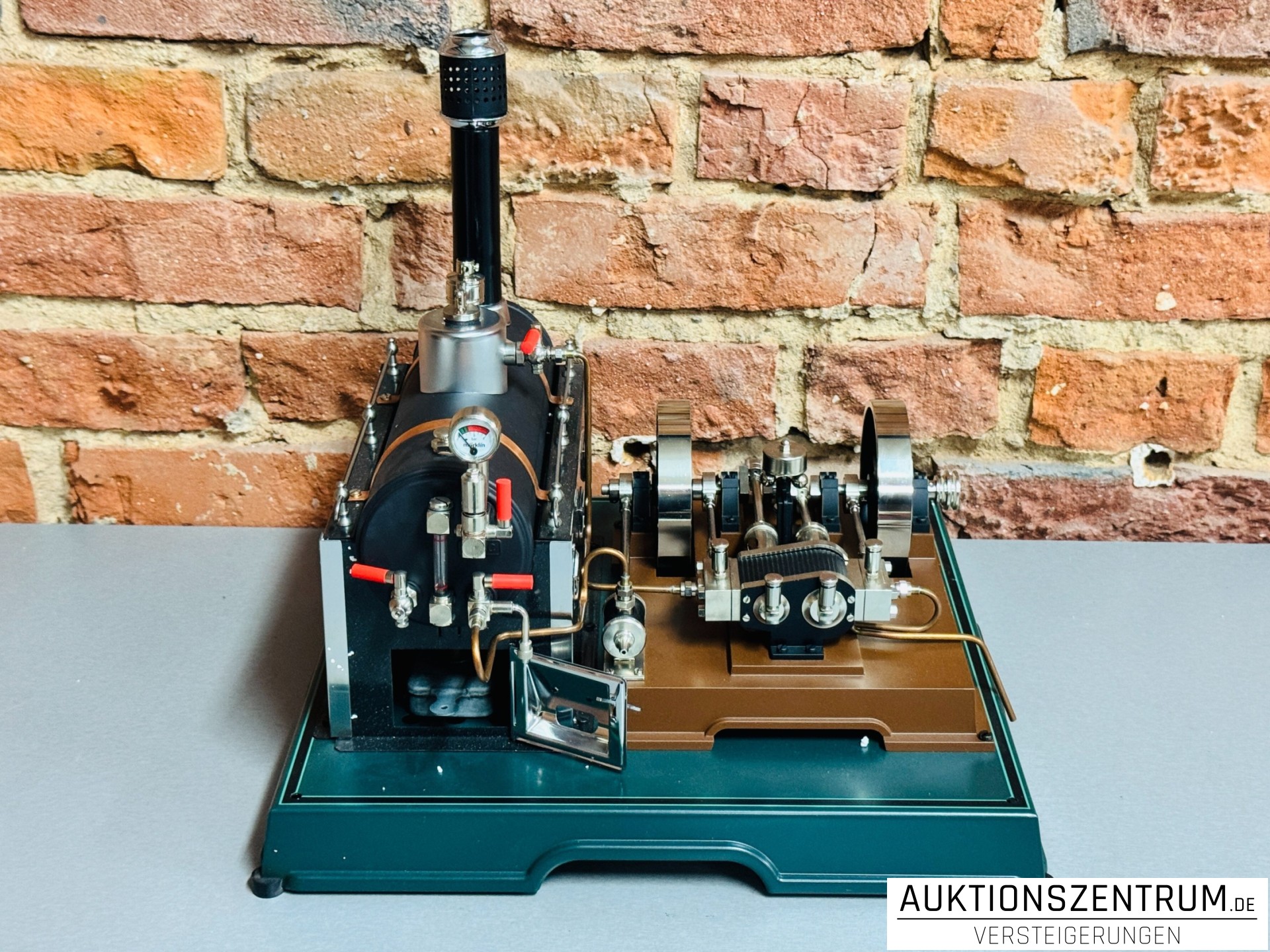Ausführung mit liegendem Kessel, Sicherheitsventil, Manometer, Wasserstandsanzeige, Speise- und Ablasshähnen sowie Brennerfach. Die Kraftübertragung erfolgt über zwei groß dimensionierte Schwungräder mit Riemenantrieb auf die Kurbelwelle. Zahlreiche Messing- und vernickelte Stahlarmaturen, Kupferleitungen sowie fein detaillierte Gestänge und Schiebersteuerung unterstreichen den technischen Charakter dieses Funktionsmodells.
