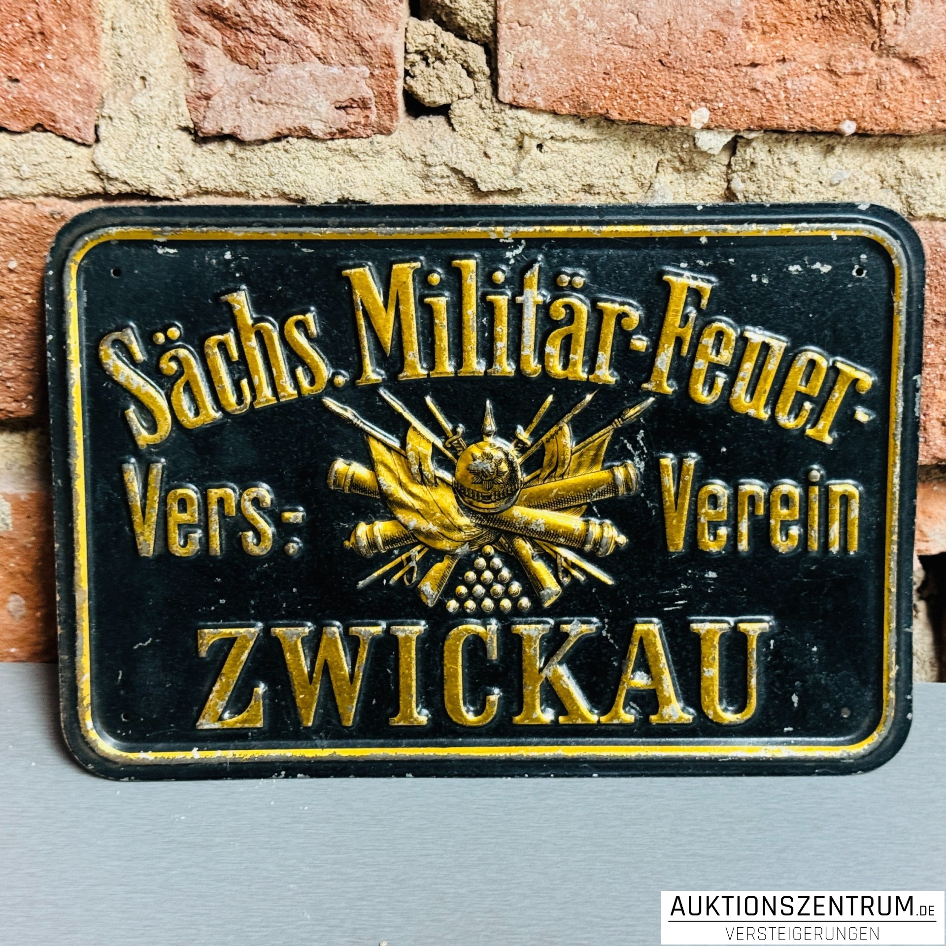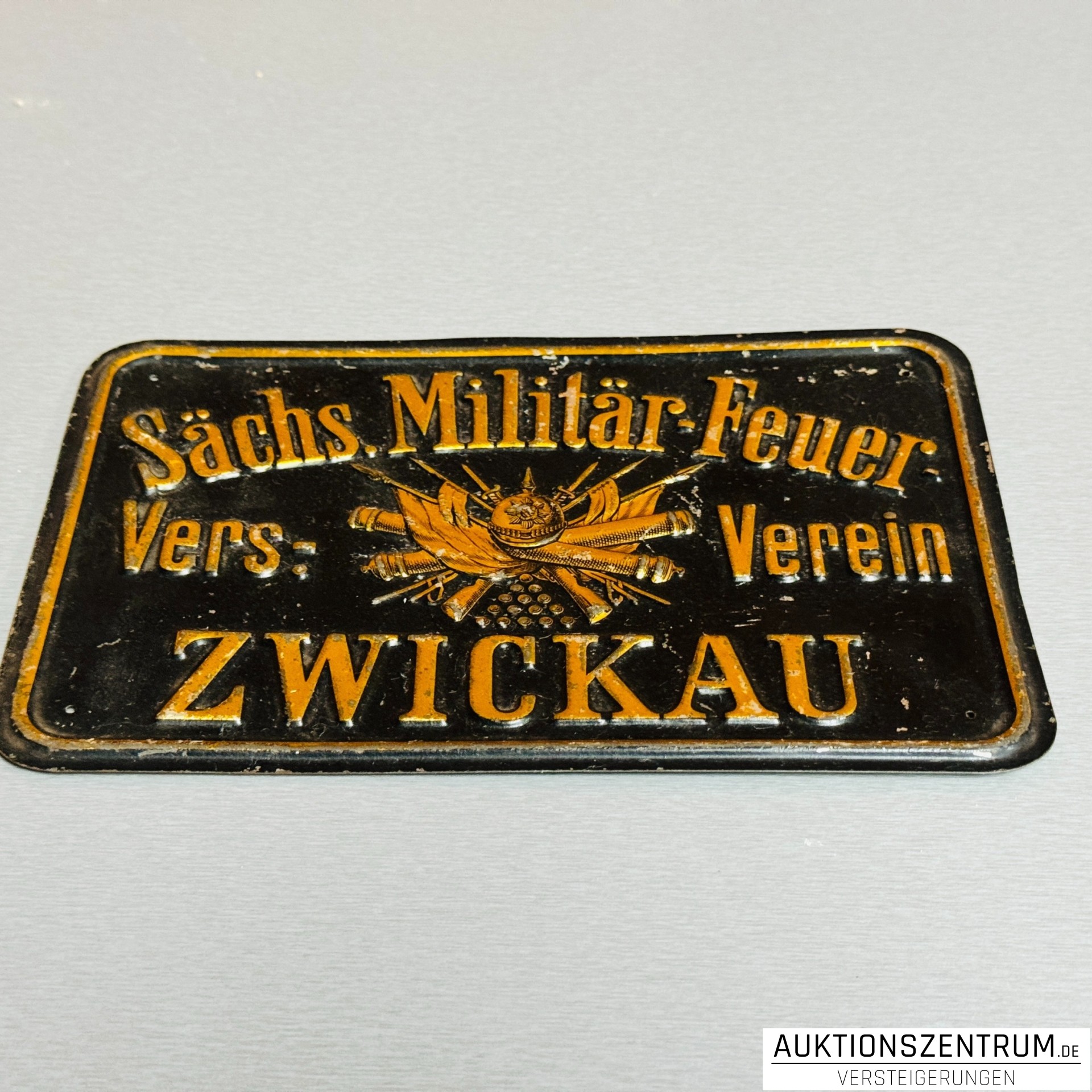Rechteckiges, gewölbtes Schild des Sächs. Militär-Feuer-Vers.-Verein Zwickau mit erhaben ausgeführter, goldfarbener Schrift und zentralem Emblem aus militärischen Attributen (Fahnen, Kanonenrohre, Pickelhaube und Kugelpyramide) auf schwarzem Grund. Umlaufender, zweifarbiger Randrahmen.