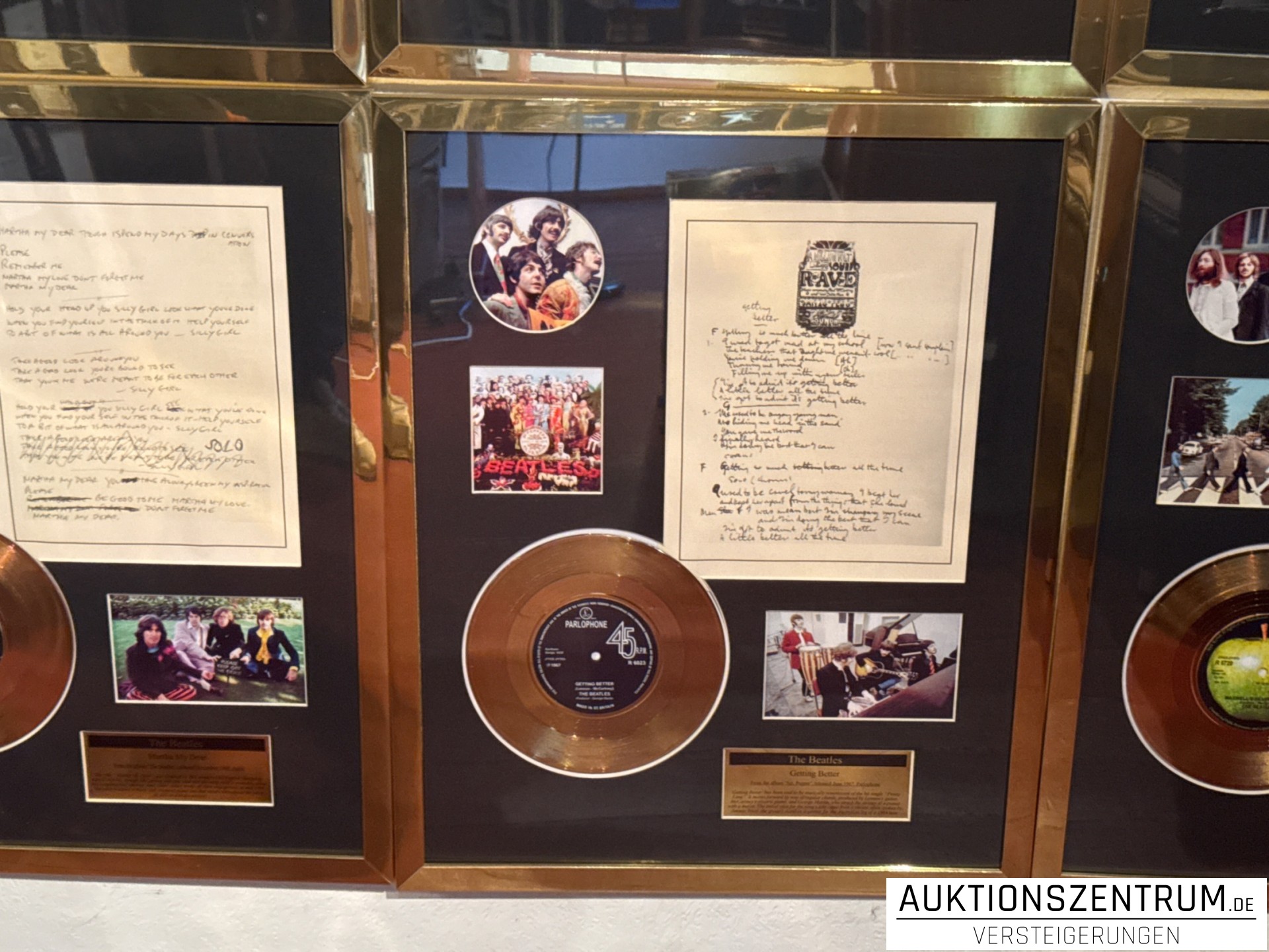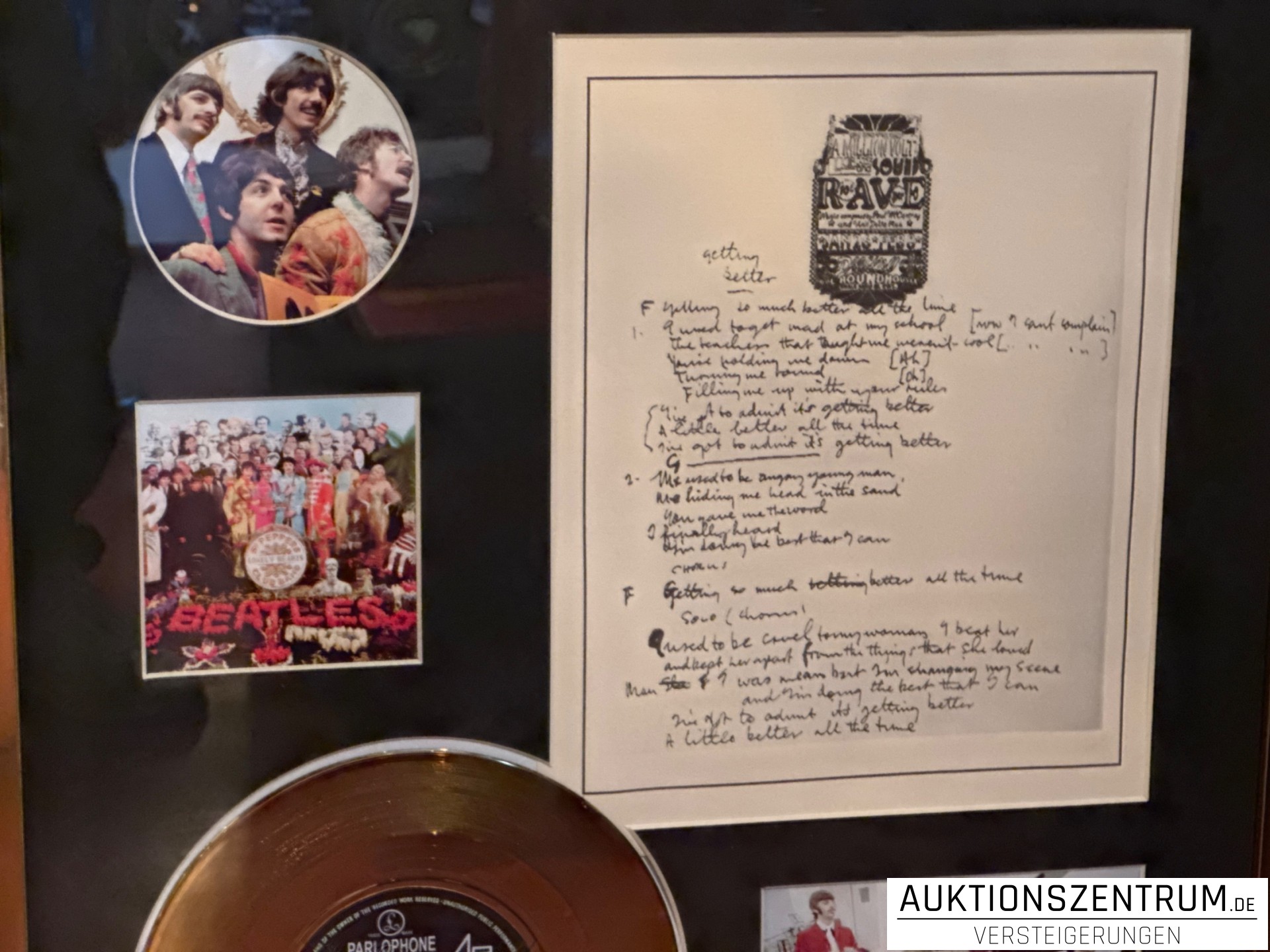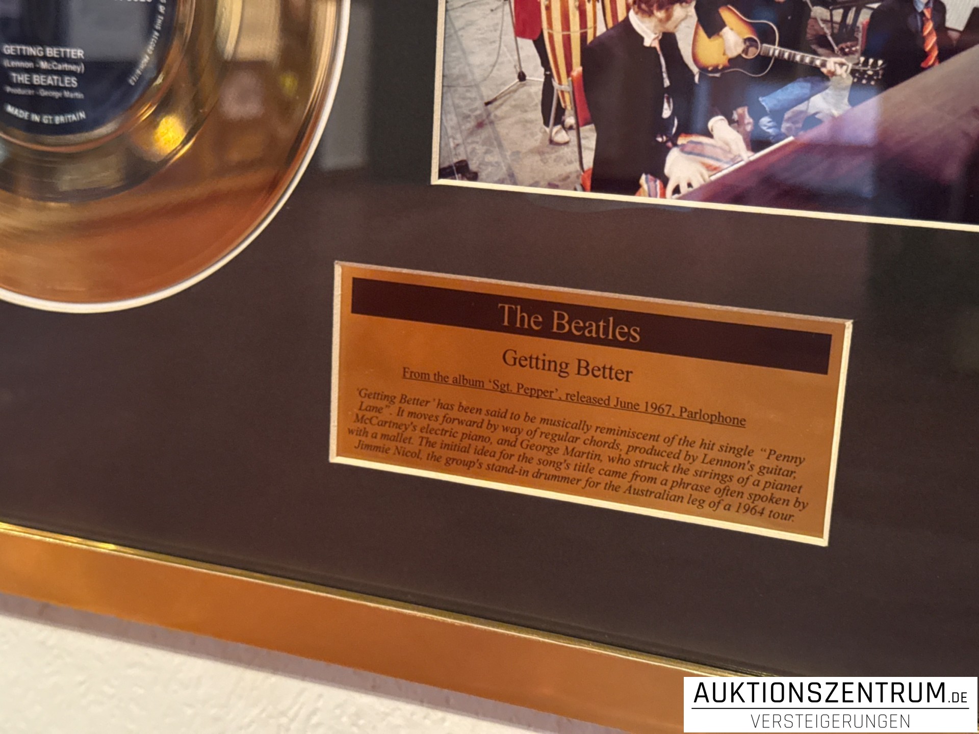 The Beatles Gold Award Display + Songtext: Getting Better, Parlophone Vinyl