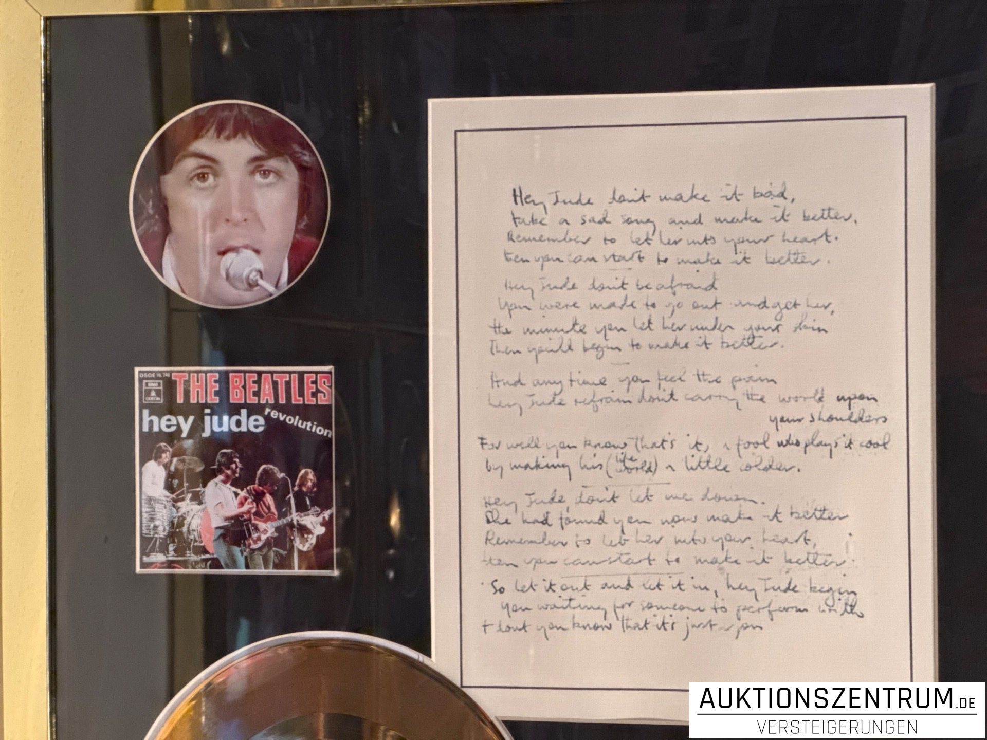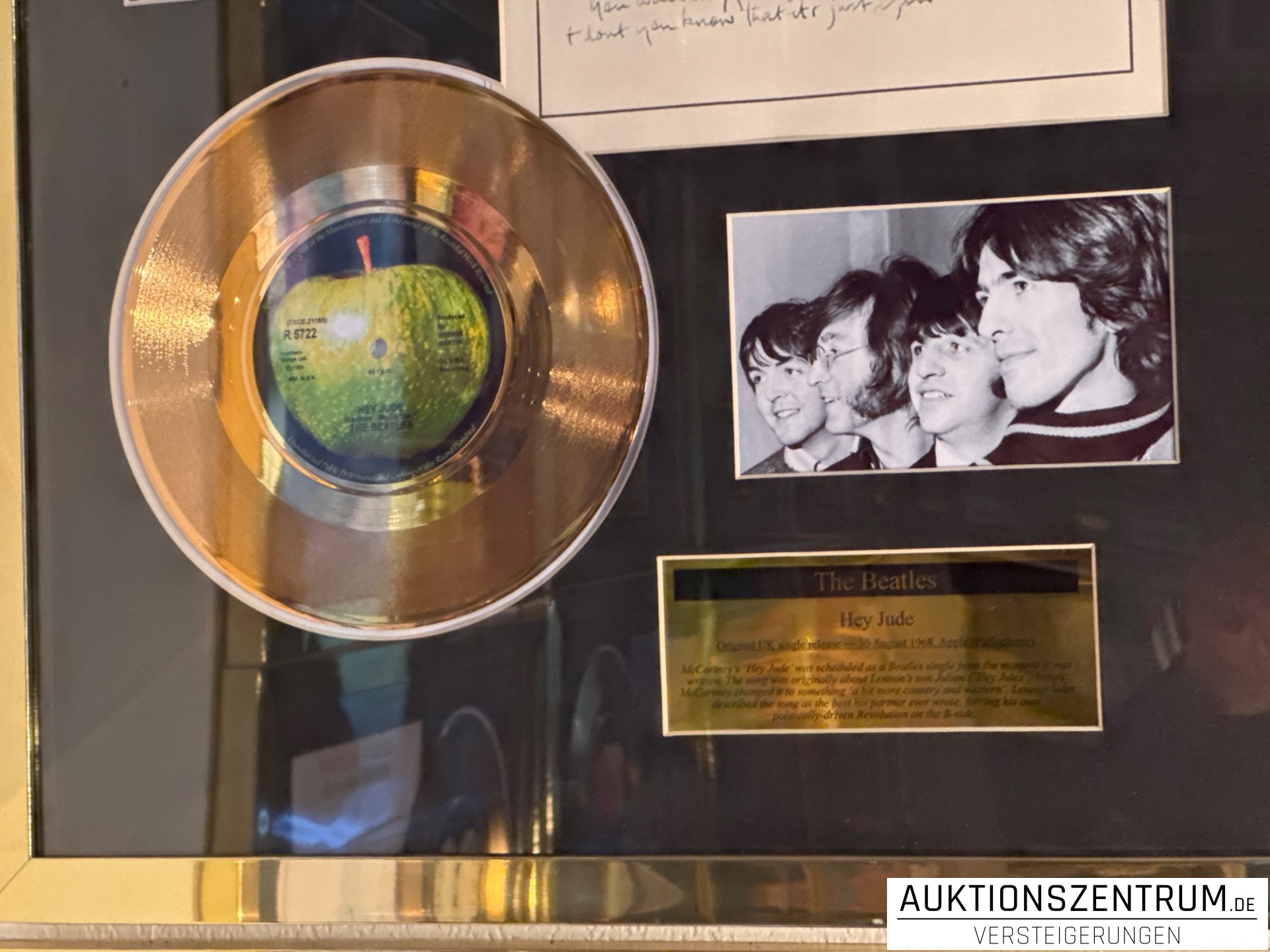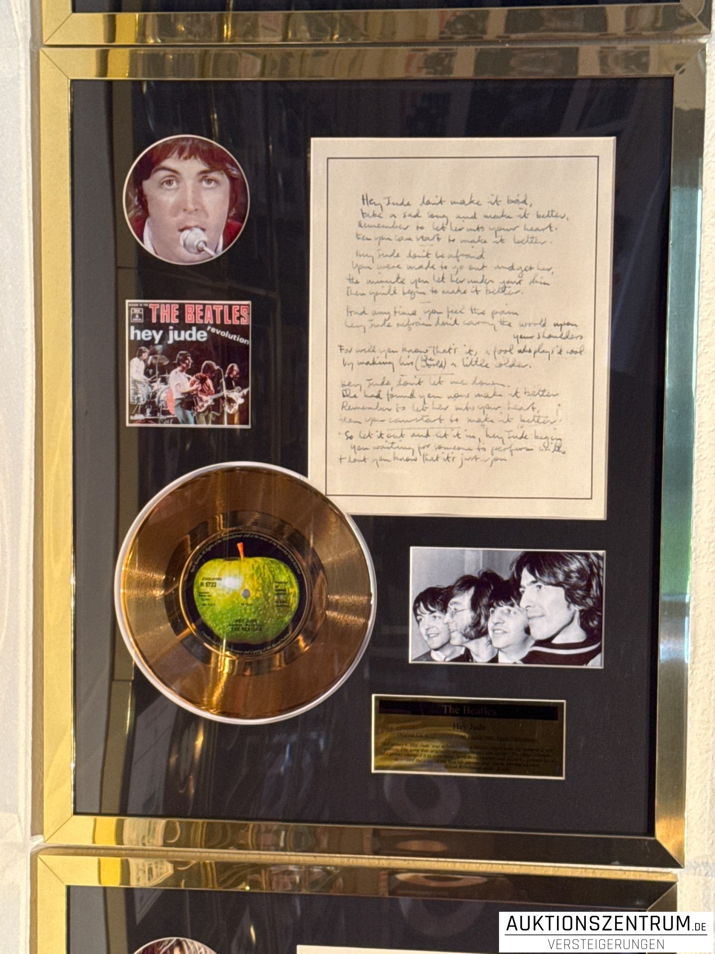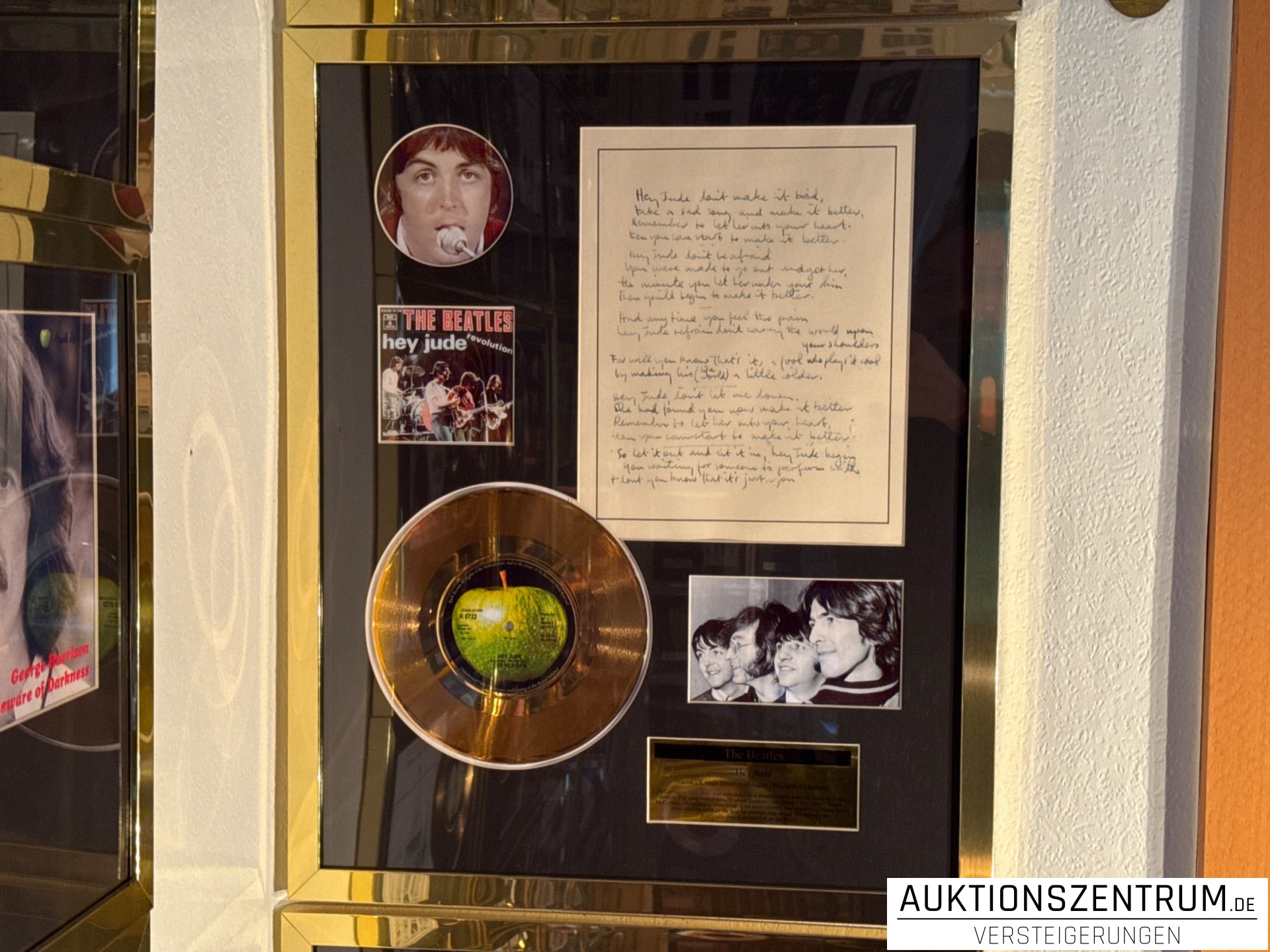 The Beatles Gold Award Display + Songtext: Hey Jude, Apple Vinyl