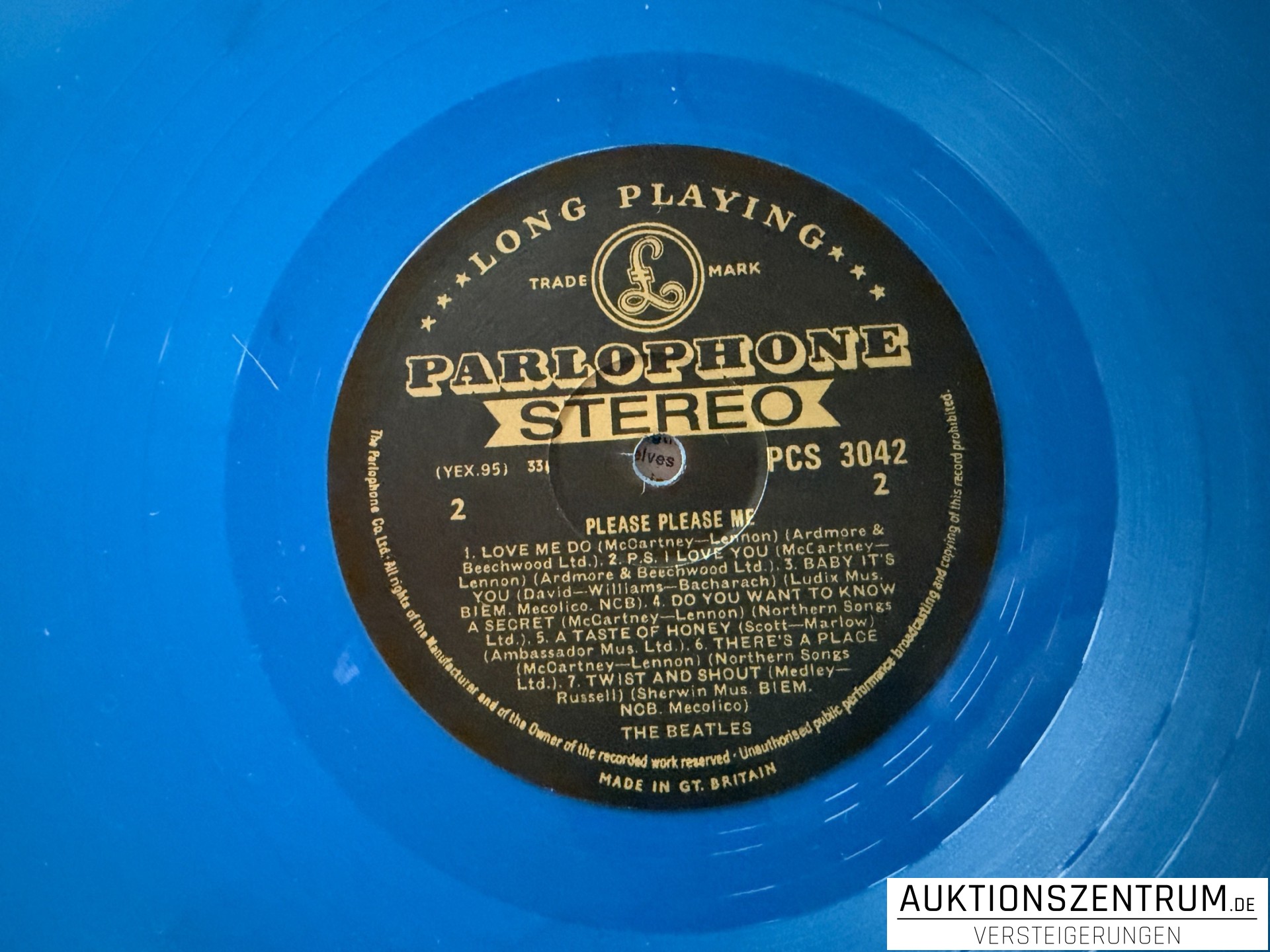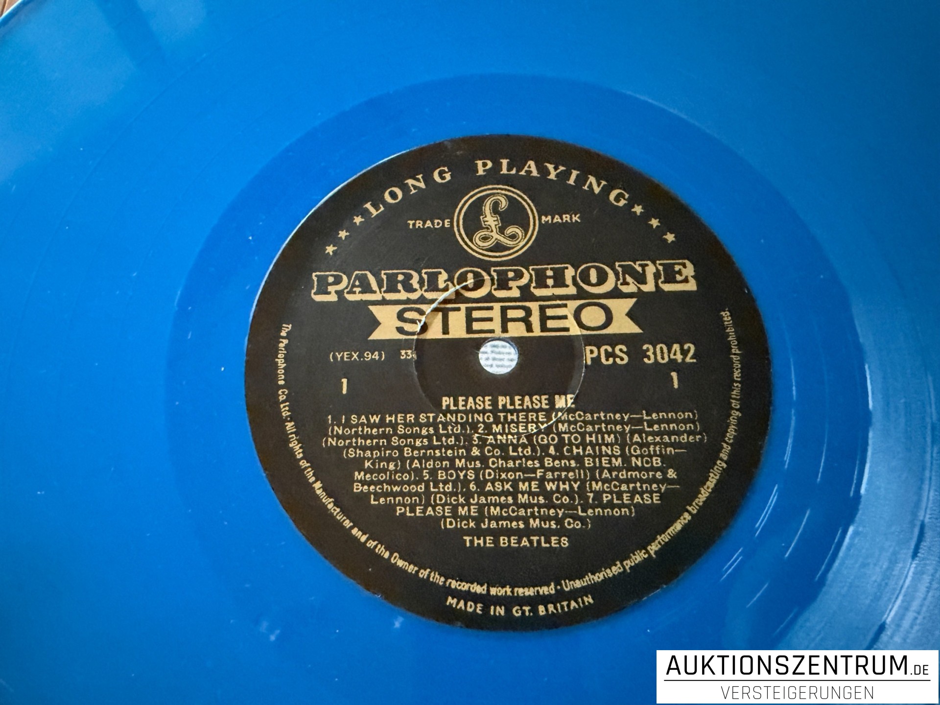 Britische Pressung des Beatles-Albums auf blau kolorierter LP im Stereo-Format.