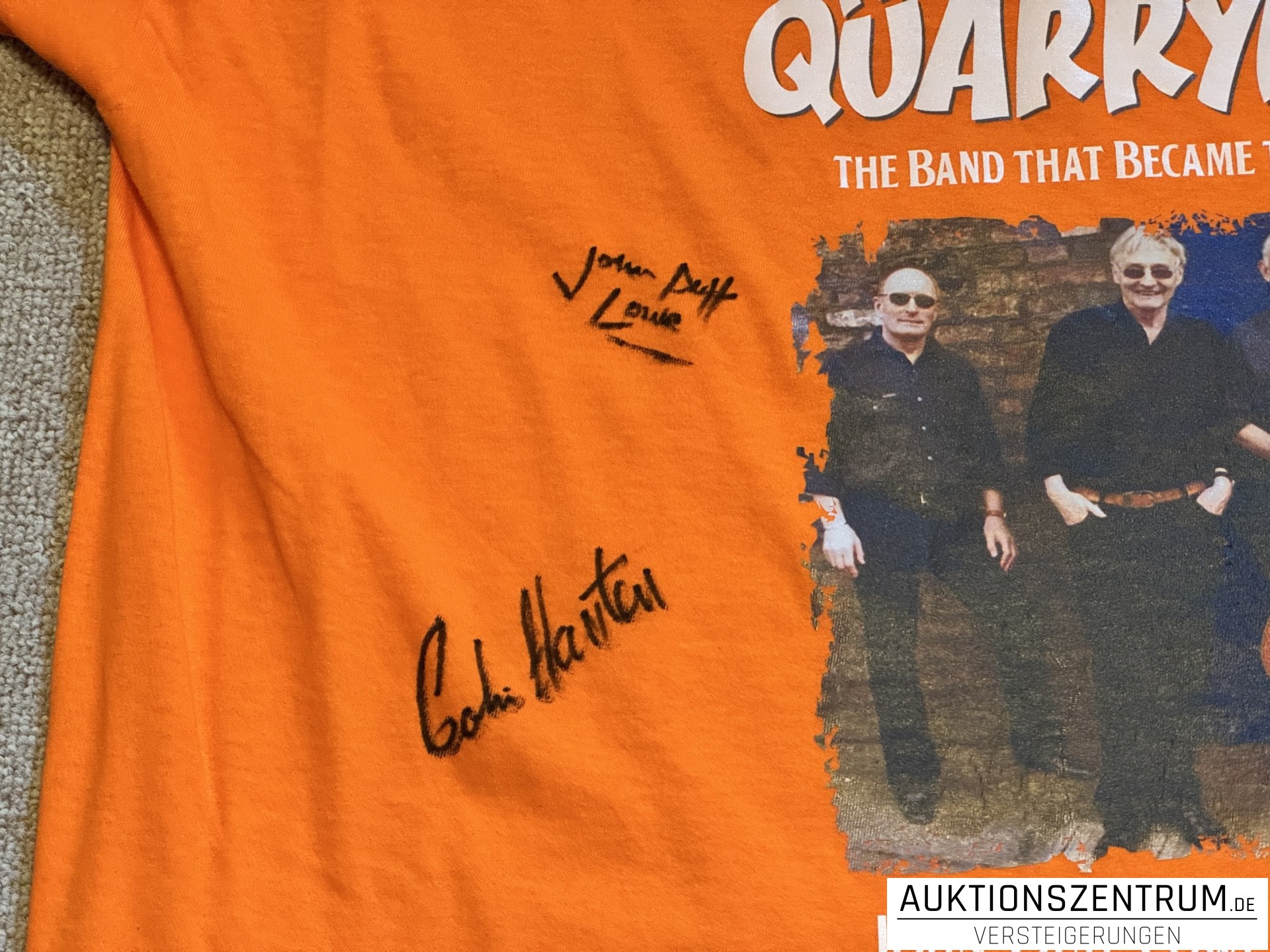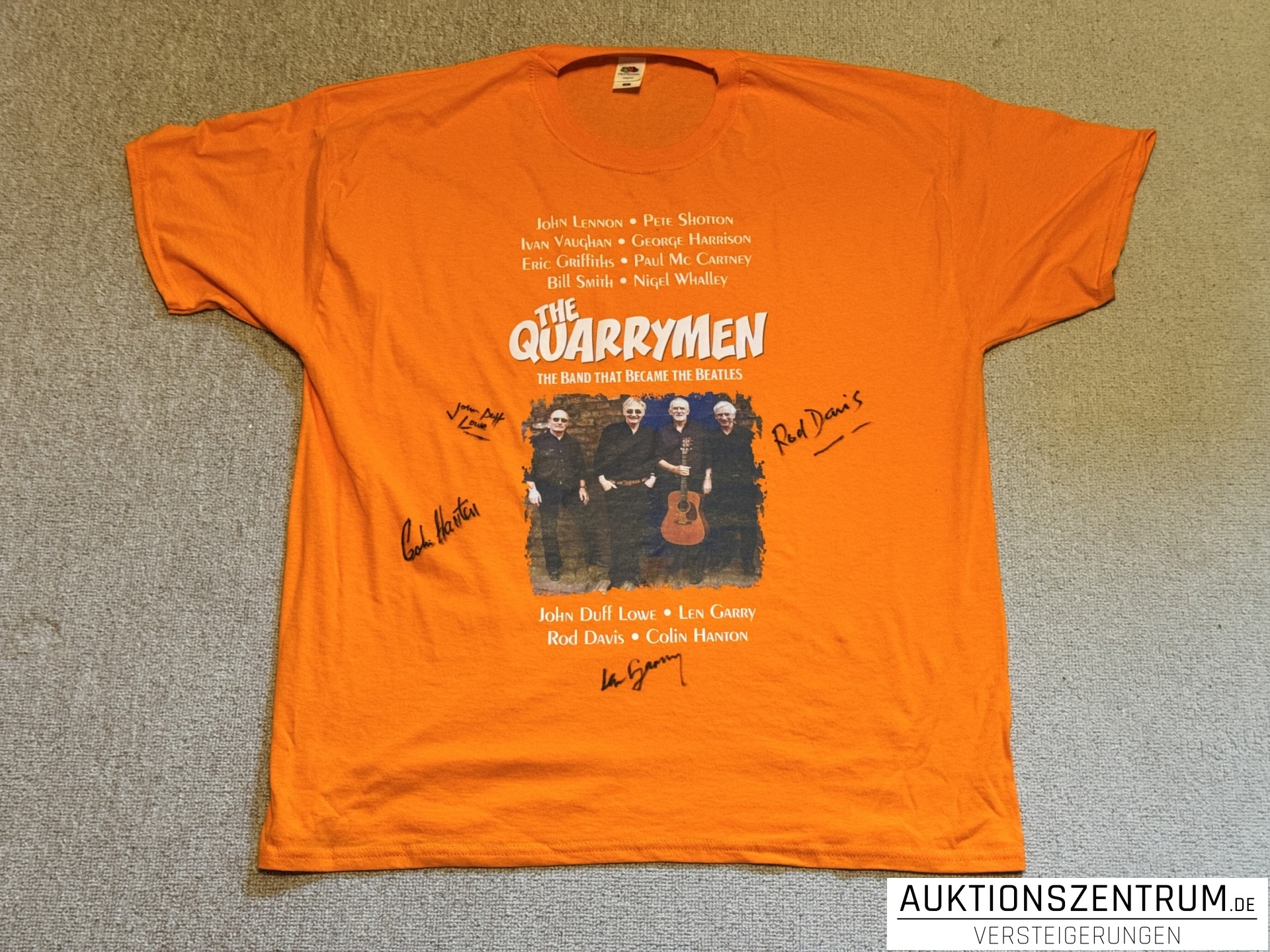 The Quarrymen T-Shirt: all artists signed , orange + Plectrum