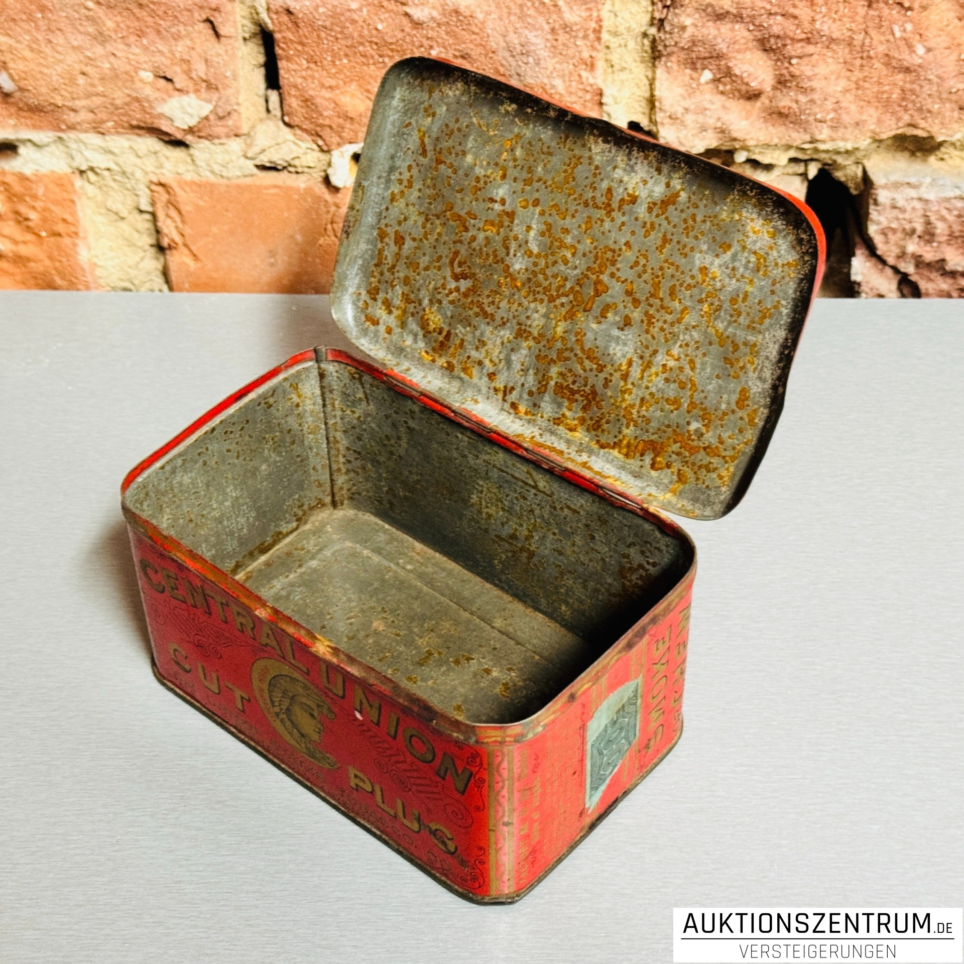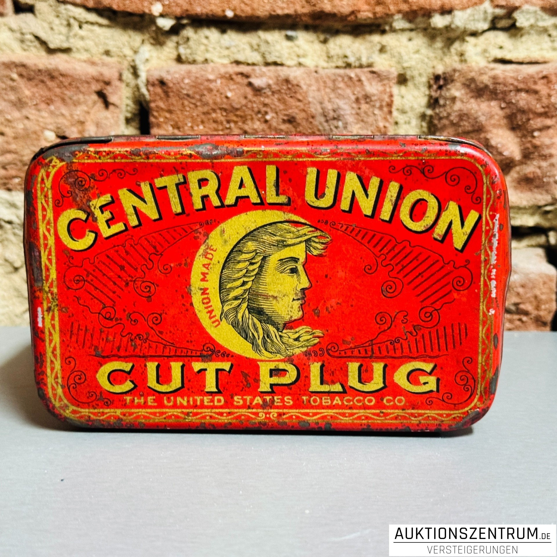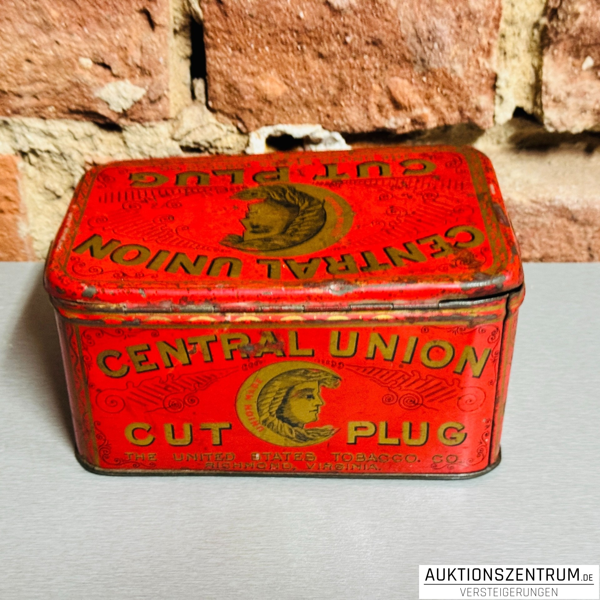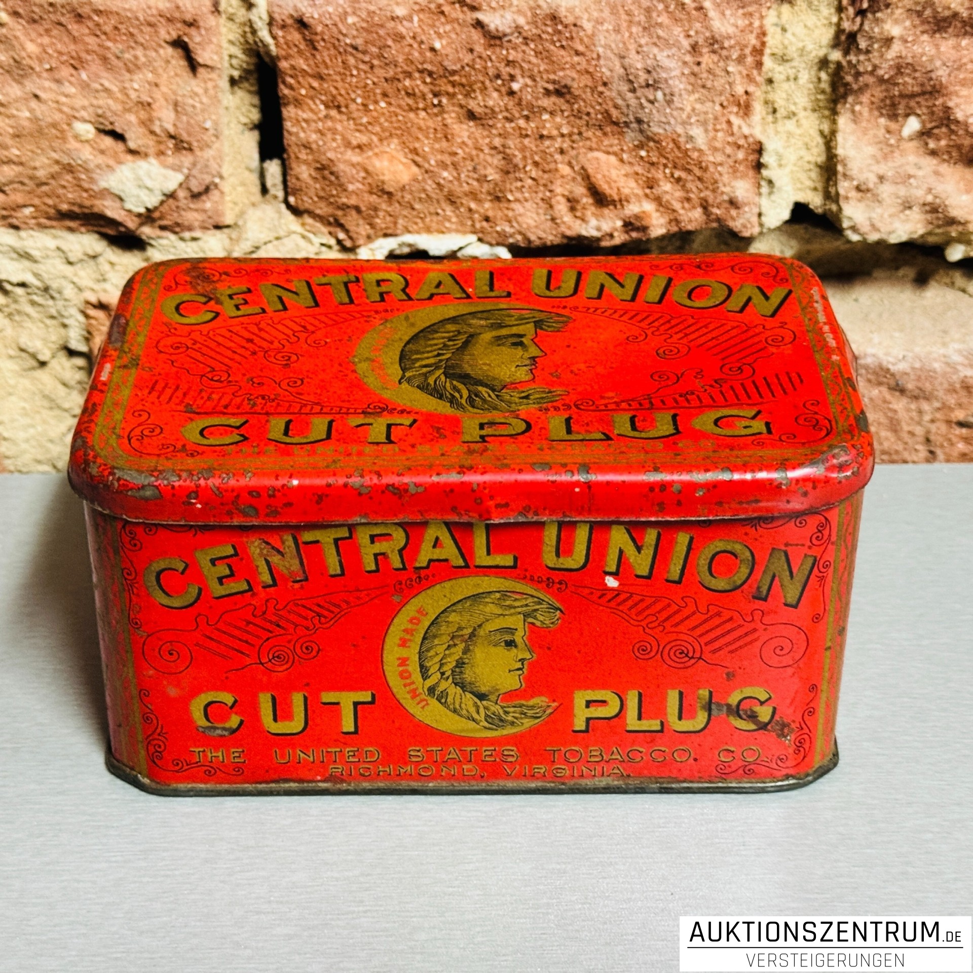 Rechteckige Werbe-Blechdose der Marke Central Union Cut Plug von The United States Tobacco Co., Richmond, Virginia. Leuchtend rote Lackierung mit umlaufender goldfarbener Schrift "Central Union Cut Plug" und dekorativem Porträtmedaillon auf Deckel und Seitenflächen.