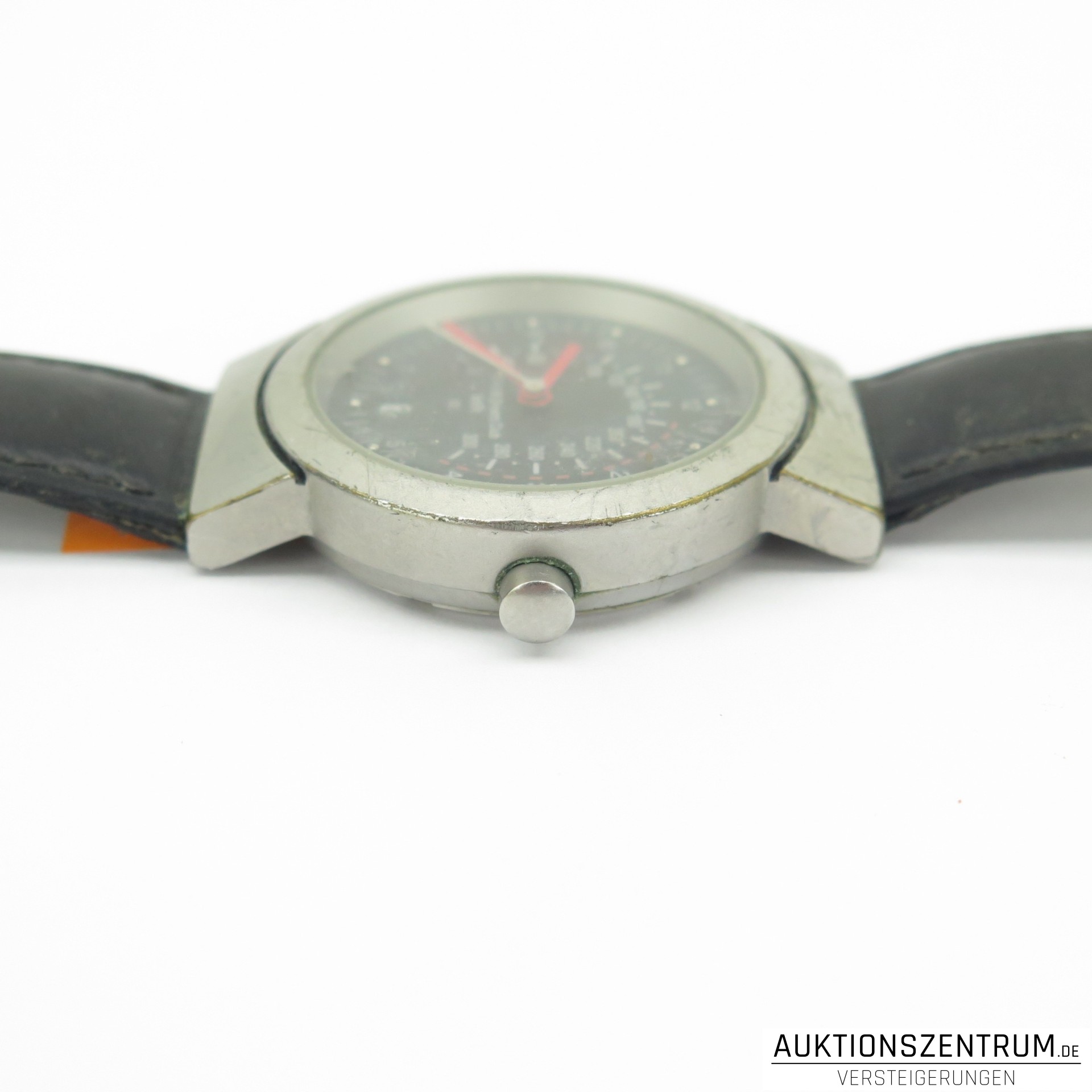 Die Uhr verfügt über eine analoge Zeitanzeige mit zentralen Zeigern, Minuterie und zusätzlicher Skala in km/h sowie ein Datumsfenster bei 6 Uhr. Seitlich befindet sich eine Aufzugskrone. Getragen an einem schwarzen Lederarmband mit Dornschließe aus Metall.