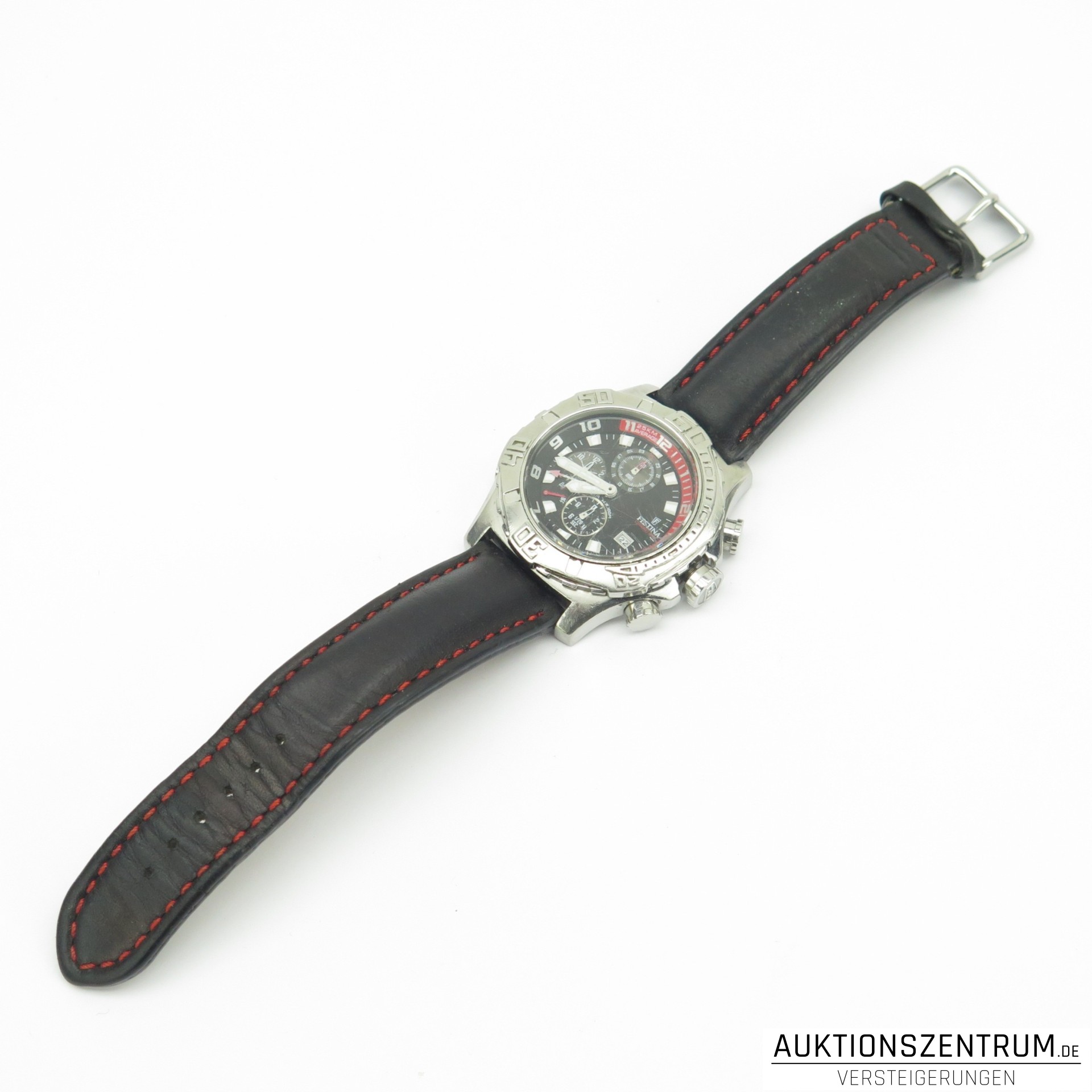 Getragen wird die Uhr an einem schwarzen Lederarmband mit roten Kontrastnähten und Dornschließe aus Metall. Gehäuse und Band zeigen alters- und gebrauchsbedingte Spuren.