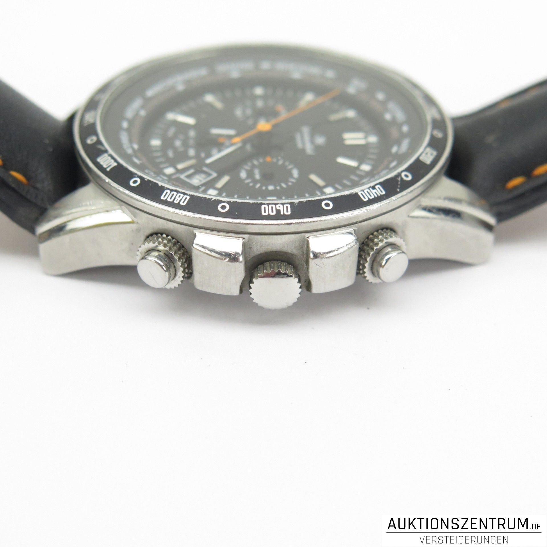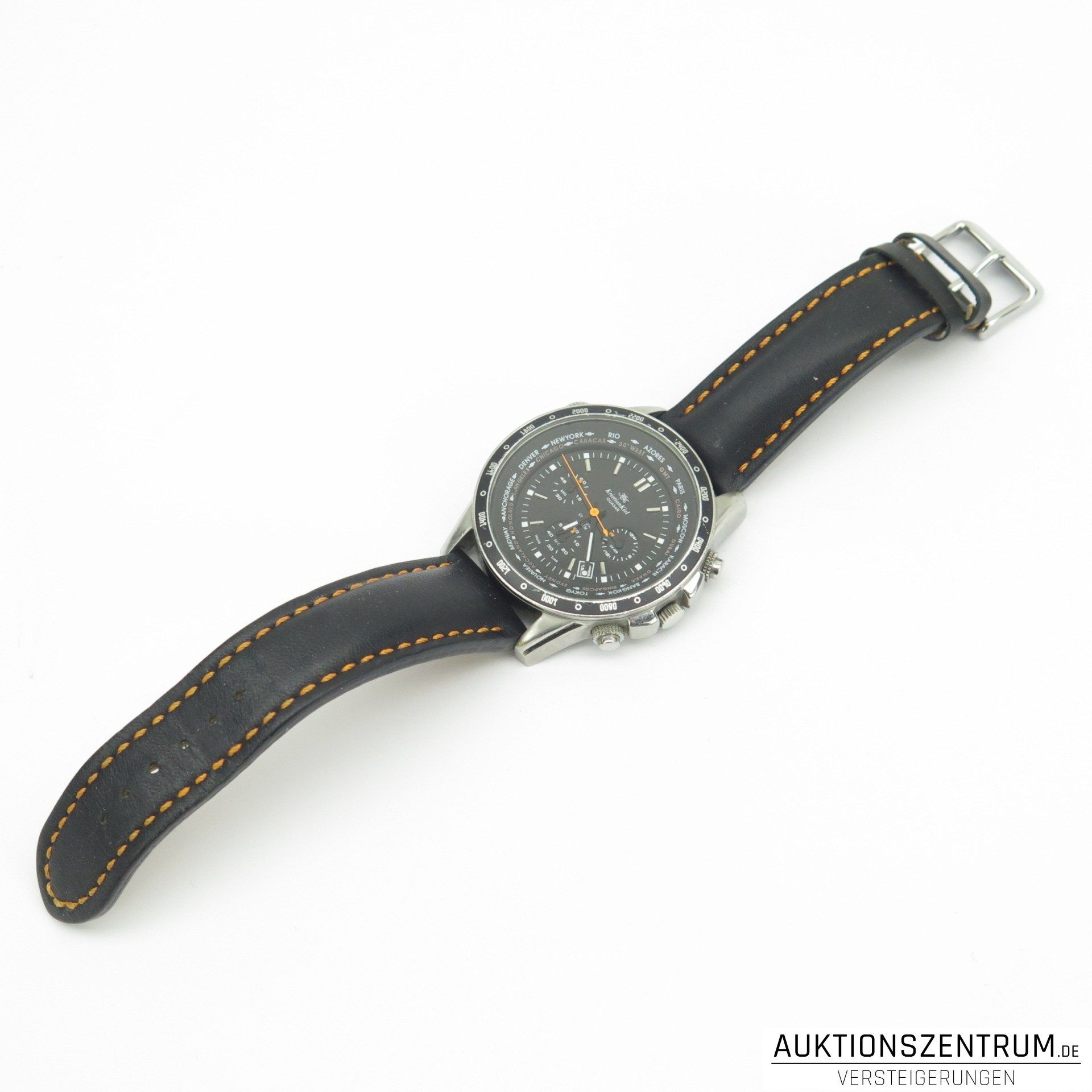 Gehäuse aus Edelstahl mit verschraubtem Edelstahlboden, umlaufender Städtering zur Weltzeit-Anzeige, schwarzes Zifferblatt mit Leuchtindizes, zentraler Sekundenzeiger sowie orangefarbene Zeigerakzente. Mehrere Hilfszifferblätter (u. a. Stoppfunktion und 24-Stunden-Anzeige), Datumsfenster, seitliche Drücker und gerändelte Krone. Auf dem Boden bezeichnet mit „All stainless steel“ und „3 ATM water resistant“.