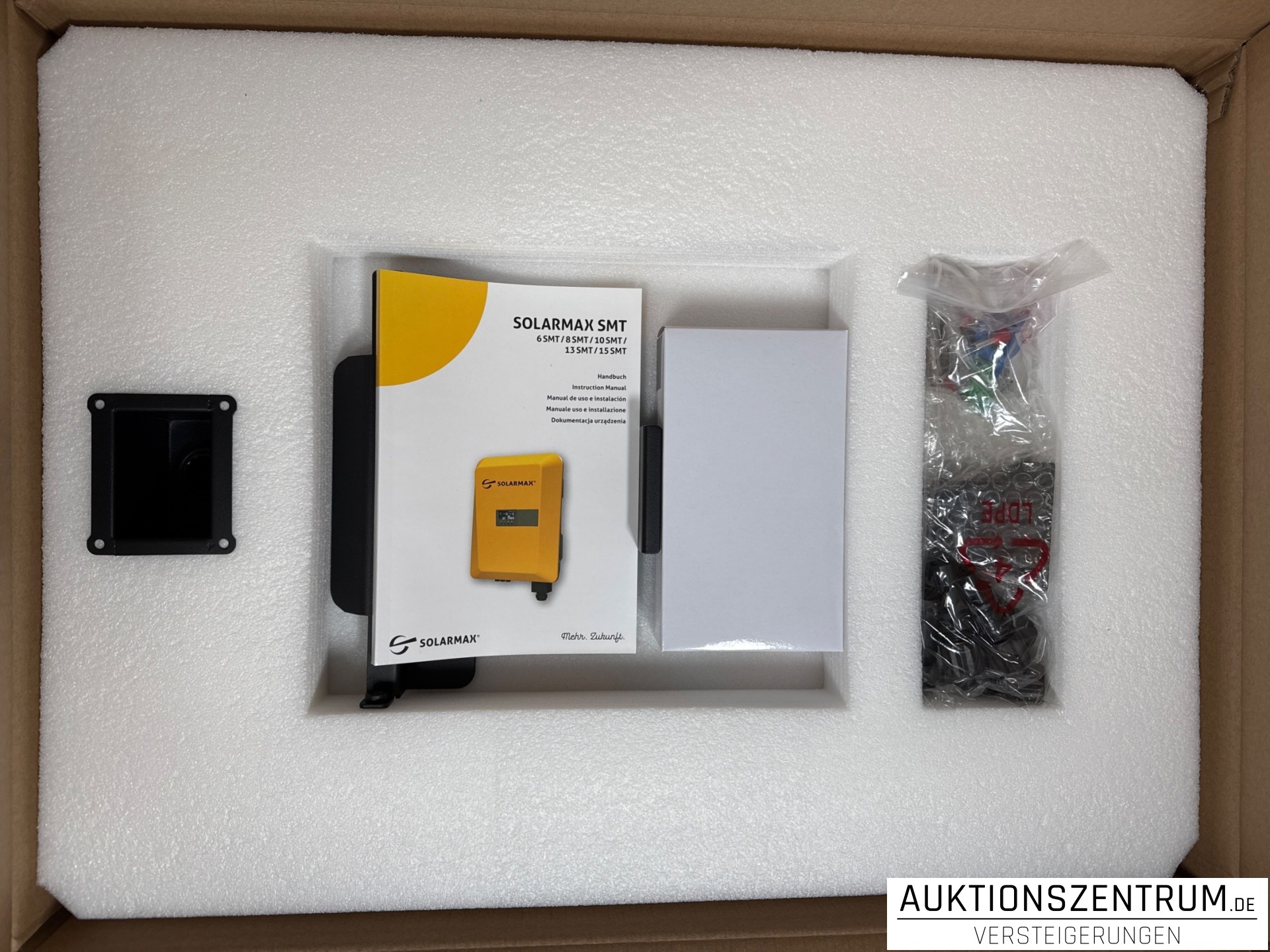 SolarMax 13SMT netzgekoppelte Solarwechselrichter mit LCD-Display (Artikel-Nr. 10113201) im Originalkarton mit Zubehör verpackt.